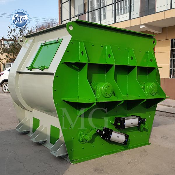 Zhengzhou MG double twin shaft paddle mixer have the characters of high mixing speed, high uniformity, less power consumption. Materials with large differences in physical properties such as specific gravity, particle size, and shape do not easily segregate when mixed in the mixer. The material discharge is by pneumatic control, material can be discharged within 3-5 seconds.